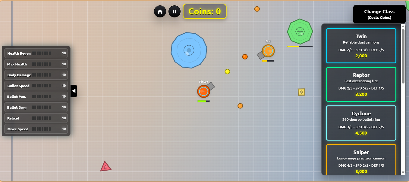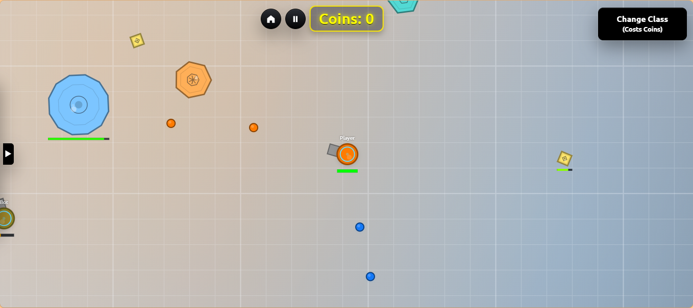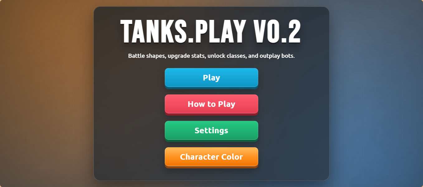 TANKS.PLAY is a fast paced top down tank shooter where you destroy shapes and enemy bots, earn coins, and upgrade your tank to survive longer.